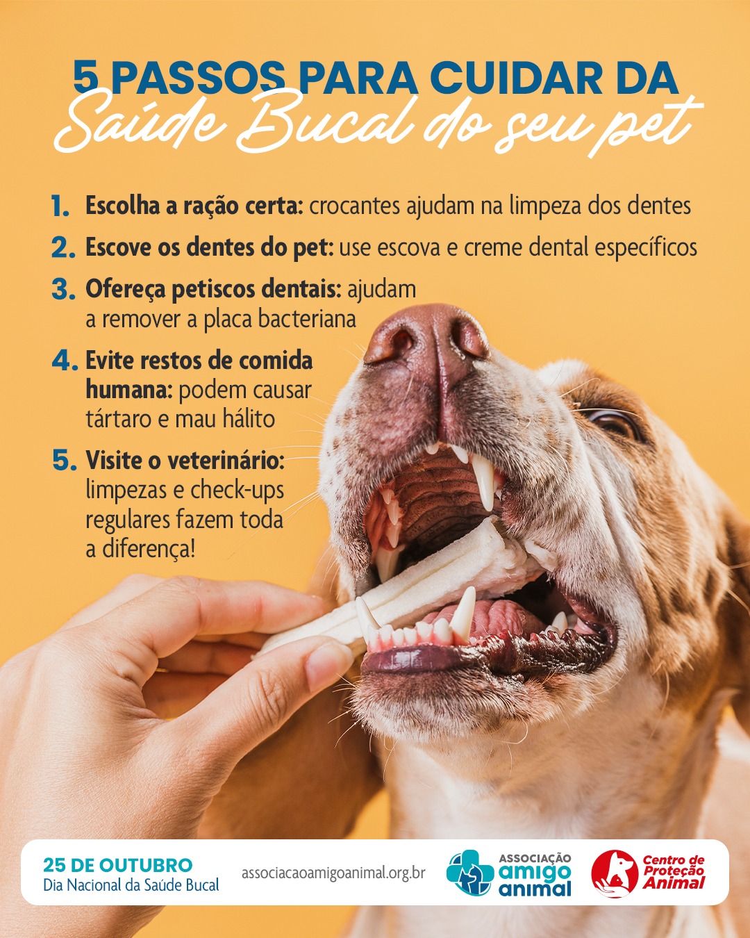 Neste Dia Nacional da Saúde Bucal, a Associação Amigo Animal reforça um lembrete importante: prevenção também é amor animal! Cuidar da boca do seu pet é uma forma de carinho, respeito e responsabilidade com quem te oferece amor todos os dias.